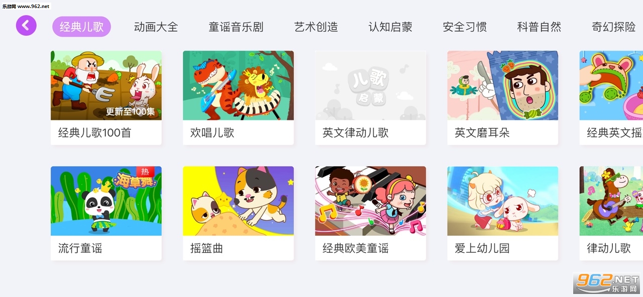 3、专为孩子打造,页面更加适合儿童使用,能够让宝宝轻松的听儿歌看动画,还能学习百科知识。