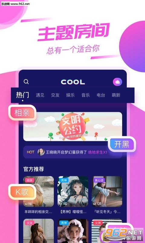 《Cool语音app》是一款趣味语音社交app,有各种语音玩法,游戏开黑,互动唱K,听故事都可以在这里完成,心动配对,寻找心动的那个TA。