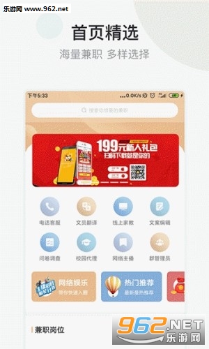《小拨鼠兼职》是一个超给力的网络兼职平台,如果你想找一份在手机上也能做的兼职工作,来这里准没错!超多靠谱的招聘信息每天更新,各种类型应有尽有,带给你极为丰富的选择。有需要的朋友快来962下载吧!