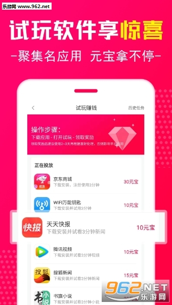 2.上面还会有很多的试玩任务哦,完成任务可以直接获取奖励;