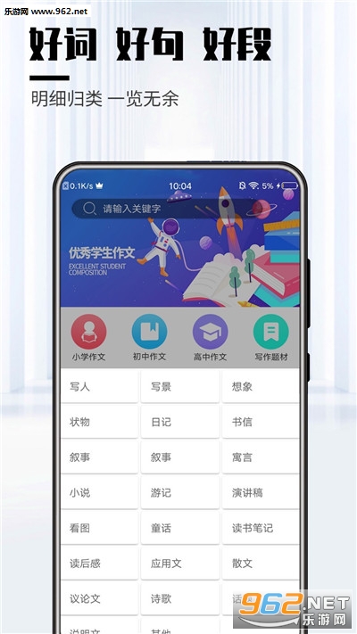 《优秀学生作文app》是一款作文素材大全,包含了从小学到高中的作文素材都有,分类明确,各种专题合集,提升你的写作能力。