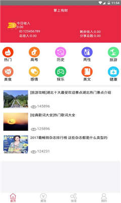 掌上有财app是一款主打新闻资讯阅读赚钱的软件,软件每天都会实时更新海量的热点新闻,各种时下火爆的世界新闻、娱乐新闻应有尽有,支持喜好订阅,每天及时给你推送,喜欢的小伙伴们赶快点击下载吧!