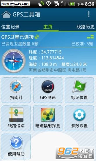 在打开gps工具箱的时候,我们首先可以看到定位到的自己的具体位置以及发现和校准的卫星,需要手机打开gps功能。
