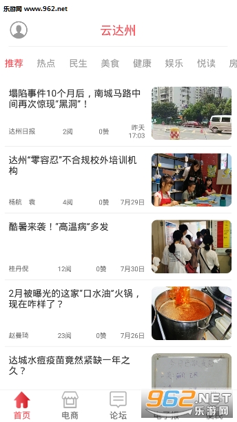 云达州APP包含首页、电商、论坛、电子报、便民五大功能模块。
