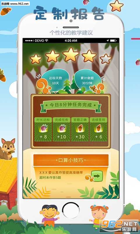 《松鼠口算》是一款儿童口算教育软件,软件中采用了智能算法使得计算练习更有效率,有利于提高孩子的思维和运算能力,锻炼孩子的眼手脑同步协同的快速反应能力,软件还有各种统计数据方便了解学习进度,有趣卡通的画面也能增加对孩子的吸引力。