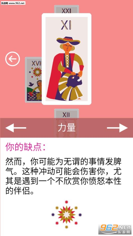 软件功能丰富,操作非常简单,很容易就能够上手,采用一种随机组合的形式,不同的牌代表不同的含义,暗示着不同的问题,挺有意思的!