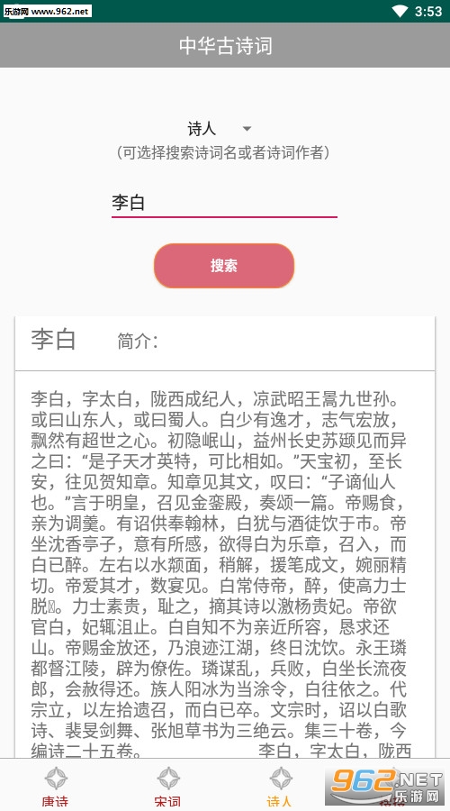 《诗词》是一款非常好用的诗词app,软件包含了所有的古诗词,方便你学习和查询,偶尔也想脑子蹦出一句诗句而不知出处就可以使用这款app进行查询,界面整洁干净,没有任何弹窗广告,如果你对中国传统文化古诗词感兴趣,就点击下载吧。