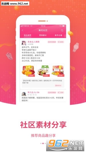 点击梨花社区,可查看商品推荐,加盟的用户可点击营销素材和新手必备,即可快速赚钱