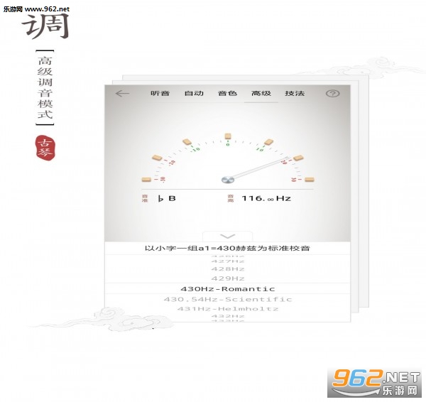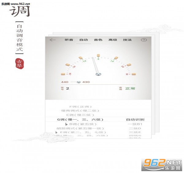 1、专门为古琴设计,包括各种调式和音准测试,不同于一般的调音器。