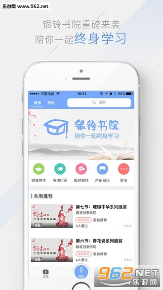 银铃书院app——无论你是拥有还是想学习健康养生、书法绘画、服装模特、声乐器乐、科技数码、时尚生活、文史外语、广场舞蹈、情感心理、家庭教育等的专业知识。