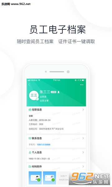 采用云计算+SaaS的模式,为企业轻松实现员工信息管理、档案资料云存储、手机拍照识别档案资料、人事工作及时提醒等服务。