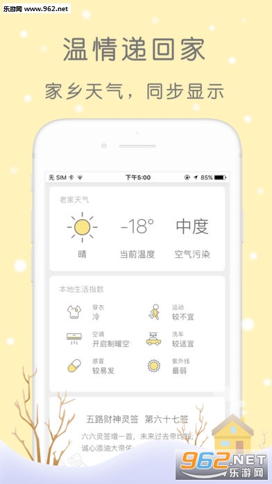 空气质量,穿衣搭配,气象信息,实时掌握,出行无烦恼;星座运势,诸葛神签,黄历宜忌,每日避凶趋吉,天天行大运;