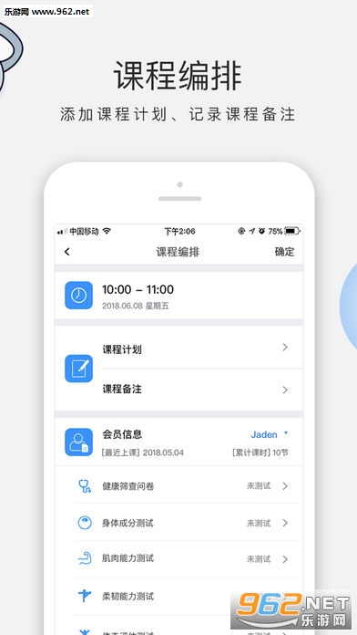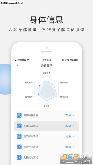 会员课时和生日记录功能,在会员生日当天送去温馨的祝福,增强广泛的社交性;详情界面对会员身体信息清晰明了,综合的身体评估测试,记录每时每刻的身体变化。