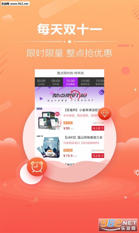 3,咚咚抢专区,品牌商品限时折扣,整点秒杀,手慢无;