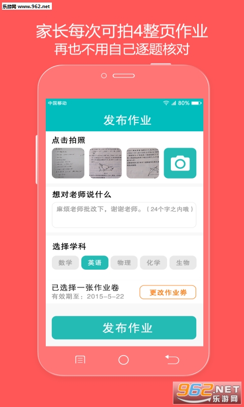 1、家长整页作业拍照:支持整页作业拍照检查,一次可拍四整页作业,家长再也不用逐题核对,超级省心省力。