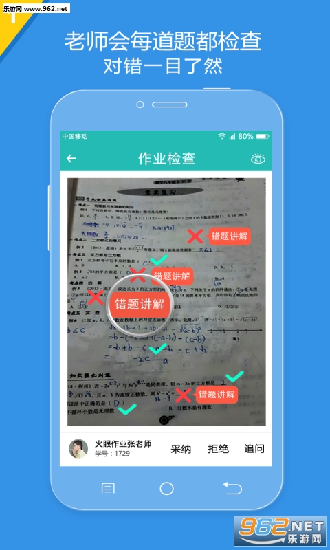 2、老师细致检查讲错:家长拍照后,在线老师15分钟内:每道题都检查(打对打错),每个错题都讲解(相信过程+关键步骤语音思路),每个错误类型都分析(错误类型分析)
