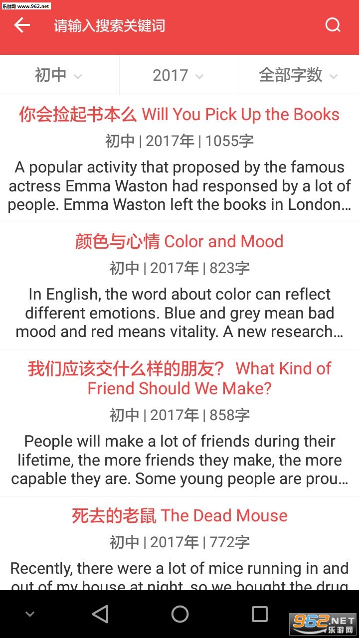 按题材可为分写人、叙事、写景、状物、读后感、想象作文、话题作文、议论文、童话寓言、演讲稿、日记,小说,期中考试作文、期末考试作文、抒情作文、说明文等,提供了按作文字数以及作文分类检索的功能。
