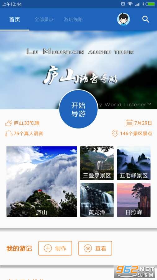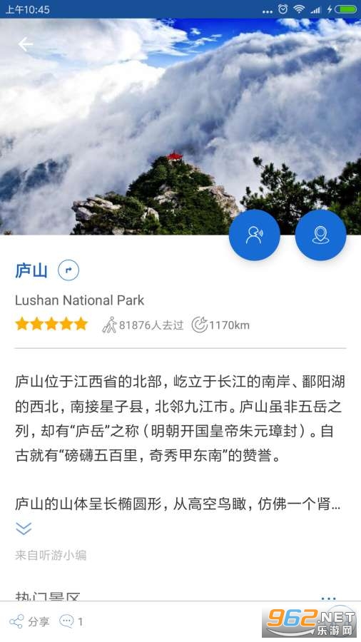 庐山语音导游是一款专门为喜欢自由行的旅行爱好者而设计的应用。应用将语音导游、门票信息、旅游攻略、景点美图、旅游足迹等全面集中展现。通过专业的智能语音导游系统,为喜欢自由行的旅行爱好者提供舒适贴心的旅游体验。