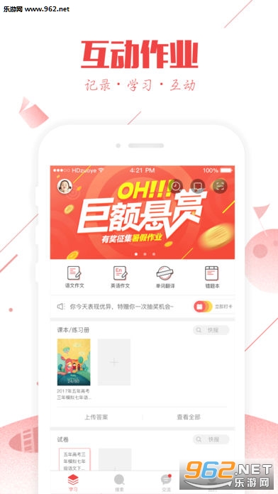 互动作业是汇集千万中小学生各科目、年级的试卷、错题、练习册解析与作业答案等学习搜题的学生阵地。