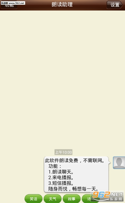 朗读助理APP,朗读聊天。来电播报。接受短信播报。满足您说有对于朗读的需求!有需要的朋友快来乐游下载吧!