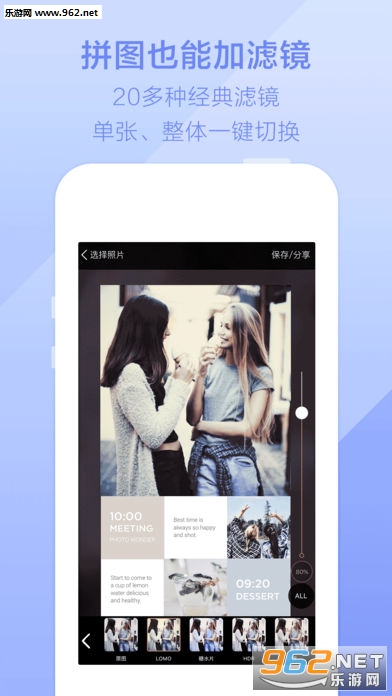 大量漂亮实用的图片效果,一键完成LOMO、秋色、蓝调、老照片、柔光等艺术效果,让同一张照片有不同味道。