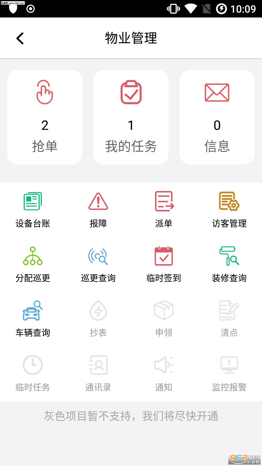 内部公告、访客管理、设备台账、监控报警、车辆查询、智能巡逻、巡逻签到提醒、装修查询、维修报障、投诉建议;