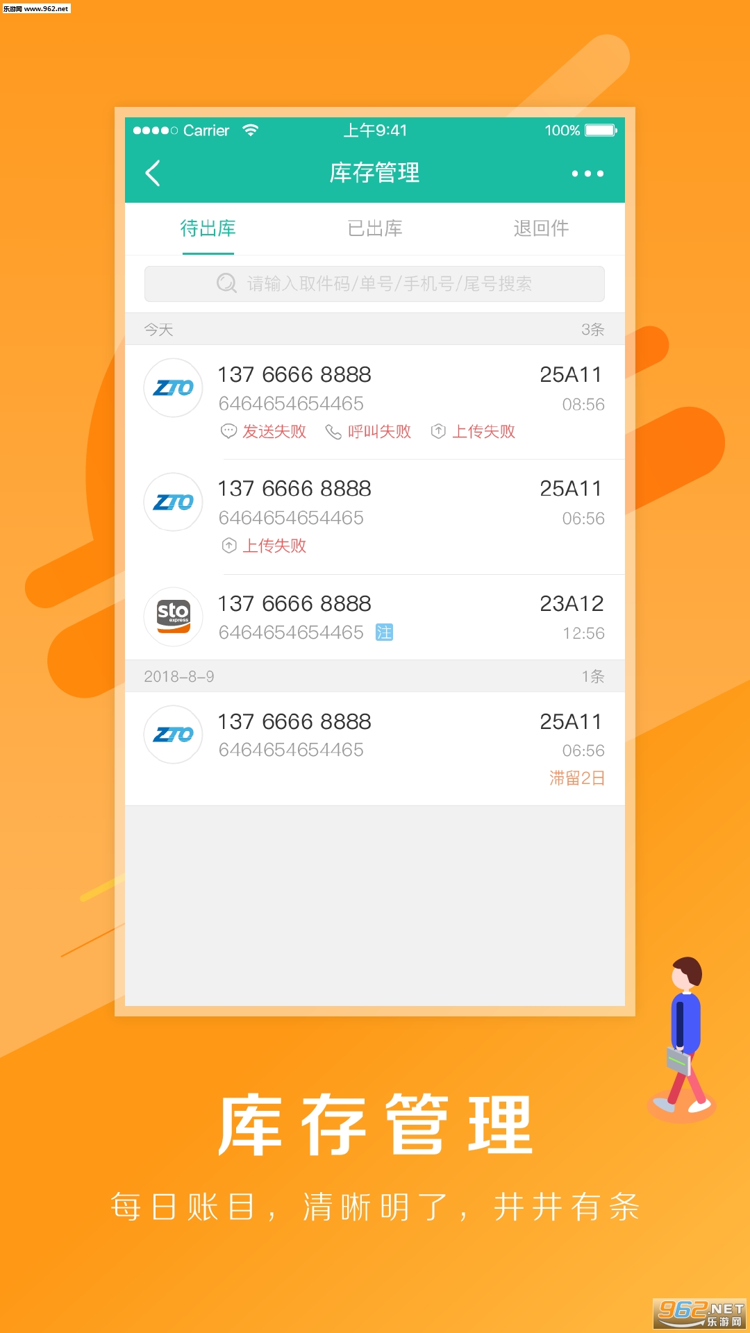 可根据运单号,手机号/尾号,客户姓名等查询库存状态,可查看详细的出入库操作记录以及照片底单。