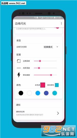 应用目前支持经典模式和环绕模式,我们可以自行设置边缘弧度、线条宽度以及移动速度。同时还可以指定某些应用在受到通知栏消息时实现闪烁效果。