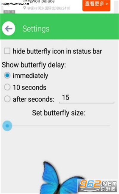 《手机屏幕养蝴蝶手机app Butterfly in Phone Lovely joke》是一款最近非常流行的手机养蝴蝶软件,还可以养一群蝴蝶哟,设置好数量及模式即可,并且在运行其他程序可以设置隐藏,完全不影响你的日常操作,这也可以称之为一款装逼神器哟。
