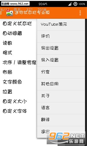 Status Bar Mini Pro(安卓迷你状态栏)是一款全能的状态栏工具。Android原来的状态栏不太好用,它只一堆凌乱的通知图标,没有多大用处。这个应用程序帮助您在状态栏上添加有意义的资讯。您可以添加不同的格式日期、电池用量、温度、可用内存(RAM)和CPU用量/负载,使您可以随时快速得知最新资讯。您还可以更改字体大小、颜色、顺序、位置、透明度和布局。