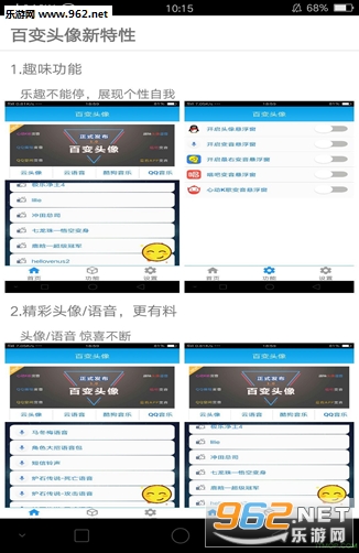 qq百变动态头像app特色介绍百变动态头像是一款可以让你的QQ头像变得有个性,(我们不一样),不仅如此还有很多动态头像素材资源,任你选,此外还有QQ变音功能,搞怪变音,恶搞朋友,同学,除了这些,还有一些有趣的变音功能,唱吧APP变音,最右APP变音,心动k歌变音,爱生活,有个性,我的百变头像我做主,内置视频教程。