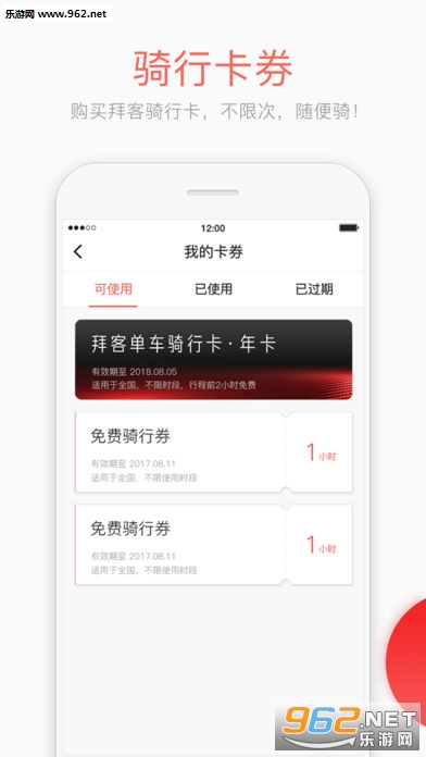 2.拜客出行:仅能在小程序上使用,用于原酷骑单车用户登入使用,原酷骑单车用户在登入后将获得免费赠送的一张会员卡及骑行年卡。