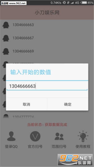 3、点击范围扫号输入2个10位数,即可开始扫号