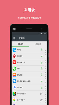 【应用锁功能】锁住您的隐私,您可以通过应用锁功能给、支付宝等您认为涉及到个人隐私的任何app加锁
