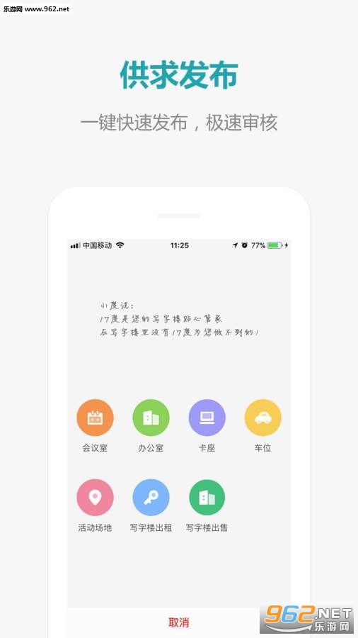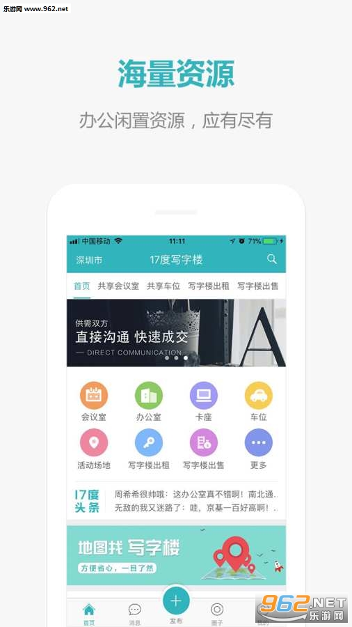 《17度写字楼手机端》是一款热门的办公生活服务软件,帮助你更好的进行办公室租赁服务,可以进行共享会议室,共享车位,以及办公楼的出租交易服务,在平台可以直接一对一交流,分享资源。共享,更节约,还可以出租你的车位,你的房屋等等。