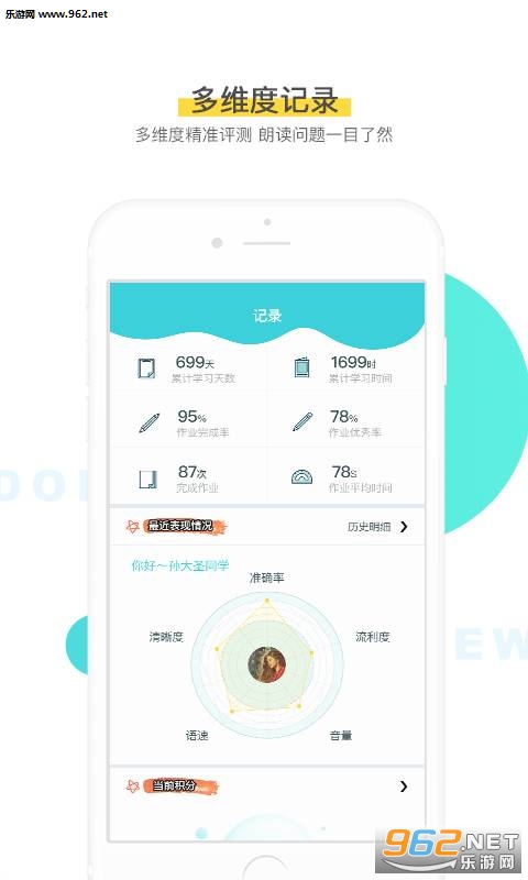 多维度统计:评测指标多维度分析,全面了解作业完成情况及自身朗读水平。