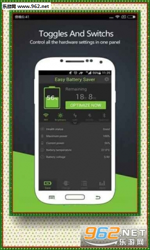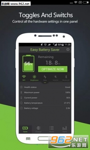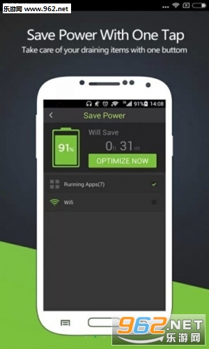 还在发愁手机电量不够用,每天一充很烦人?962小编今天为你推荐一款《省电通app》是一款实用型的省电小助手,APP占用的内存非常小,你可以一键关闭后台应用,更智能省电的电池优化工具,实用便捷。最大限度帮助您延长手机使用时间30%以上。手机电量可以使用五十小时哦,而且不影响任何功能的使用,非常不错,还在等什么?