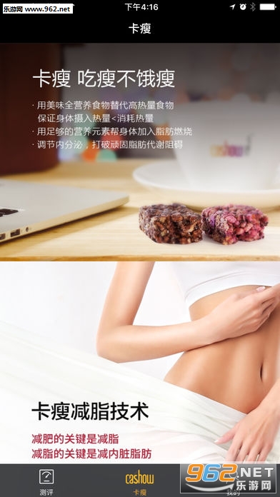 卡瘦,您的私人健康减脂专家,提供多项健康指标评测,使您快速了解自己的基本健康状态和多项身体指标。卡瘦应用可以快速的连接体脂秤,精准测量您的身体各项指标,并提供详细的数据实时展示。只需10秒钟,它就能告诉您关于身体的多种指标:体重、体脂率、BMI、身体年龄、身体状态指数、基础代谢率、蛋白质、水分、肌肉、骨骼肌等指标。周期记录您的评测数据,进行时间统计和历史数据分析,让您简单明了的获取您的健康走势。