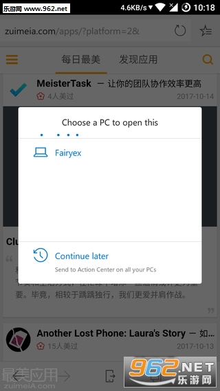 第二个独占的功能是 Edge 现在可以将手机上正在看的网页直接发送到电脑上打开,只要电脑更新了秋季创意者的 Windows 10 并且在 Win 10 的设置——手机里面绑定了手机即可。