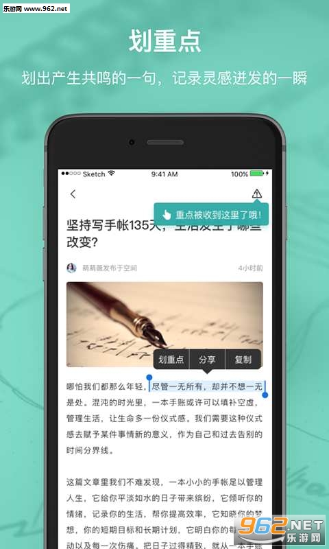 轻轻划出引发共鸣的词句,记录当时迸发的灵感,也可分享给好友,或在朋友圈展示你的逼 格。