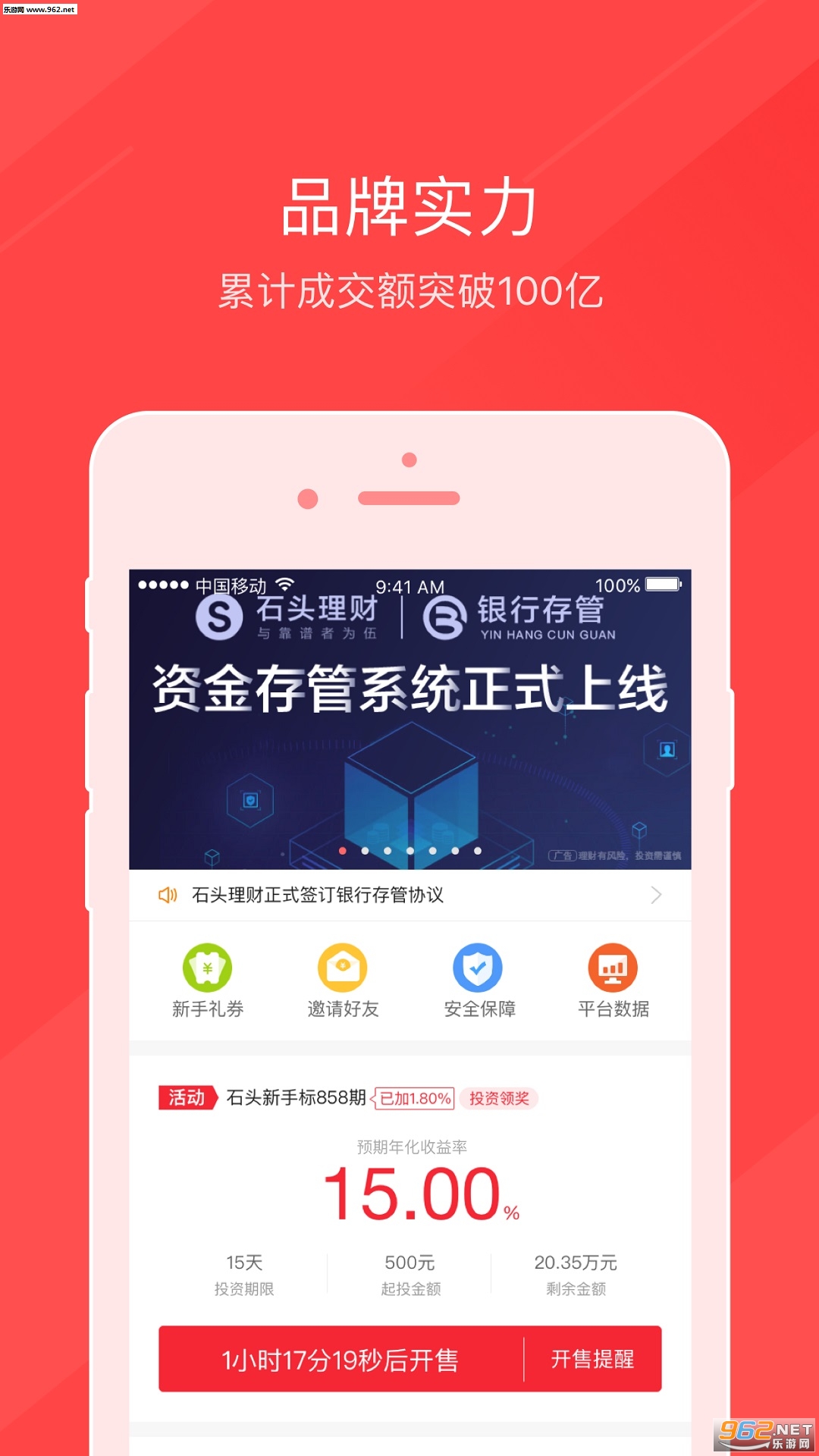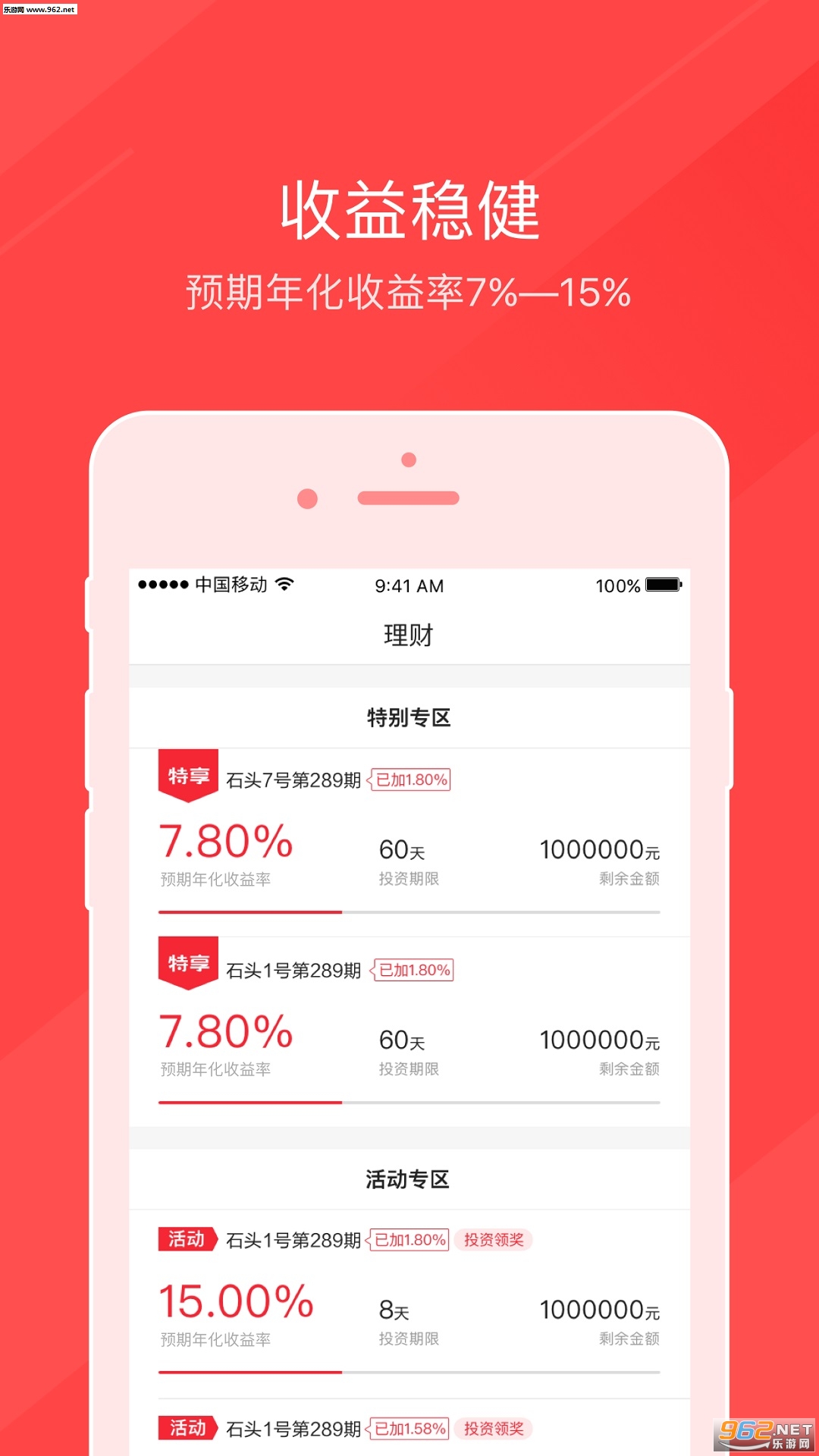 石头理财是一家专业的国资背景互联网理财平台,为投资人群提供优质透明的理财产品,预期年化收益7%~15%,500元起投,0手续费。2026年3月,石头理财获得国资企业战略入股,正式升级成为国资背景理财平台;7月,平台与AAA级信用的北京银行实现资金存管合作,并配备五重风控体系,保障投资人资金安全。目前,石头理财总成交额突破100亿元,用户人数超40万人。