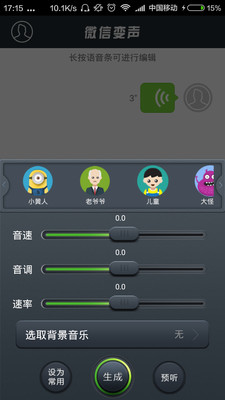 让你的声音不再平凡普通,让你可以随意将你要发到的语音变成任何声音。包含N种预设参数,,变成男声或女声,老人或小孩,御姐或萝莉,还有机器人、小黄人……和高度自定义的设置参数,想想怎么变就这么变。