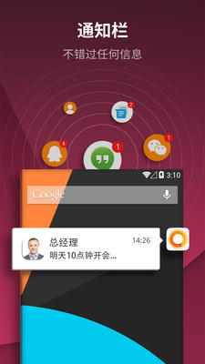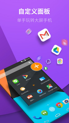 替代传统物理键:除截屏、返回、home主屏,锁屏以外;最近使用记录、屏幕亮度、音量、蓝牙、WiFi、移动网络、自动旋转等功能一键设置。