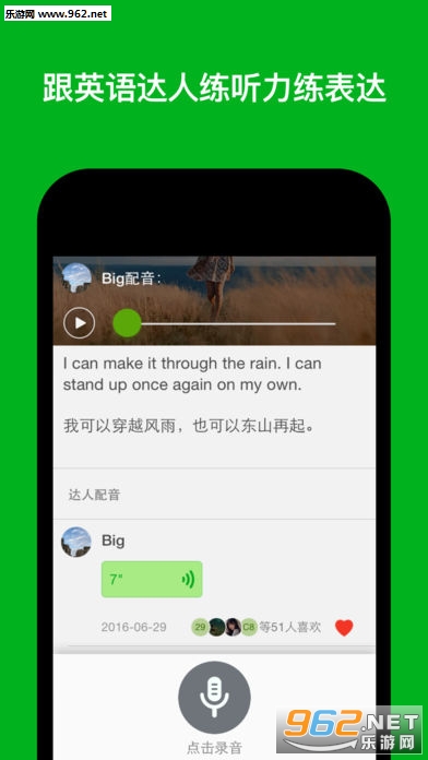 记得一位英语老师在中是这么介绍自己英语口语学习经历的:其实我以前也很‘羞涩’,中国没好的语言环境,自己还害羞不张嘴,只能一个人跟读模仿自言自语编对话练习。后来读大学,大一经常上台唱歌演出和代表学校出去参加各种比赛,大二跑到新东方兼职教英语,这才让我变得如此‘奔放’。现在我每天还是会自言自语说英语。我想我这辈子也改不了。但我很享受。 我们设计这一系列产品的最终目标就是打造一个小而精致的环境,让想说英语的童鞋们淋漓尽致的说出自己的英语心声。 每天6分钟英式英语,天天更新,听说结合。这里有良好的英语氛围,可以与其他同学一起练习、一起坚持。想练说一口地道英式口语的童鞋不要错过。 产品界面精心设计,简洁漂亮。操作简单方便,容易使用。我们致力于让英语学习者在享受英语学习的乐趣中提高英语,摆脱考试英语,提高英语应用能力。