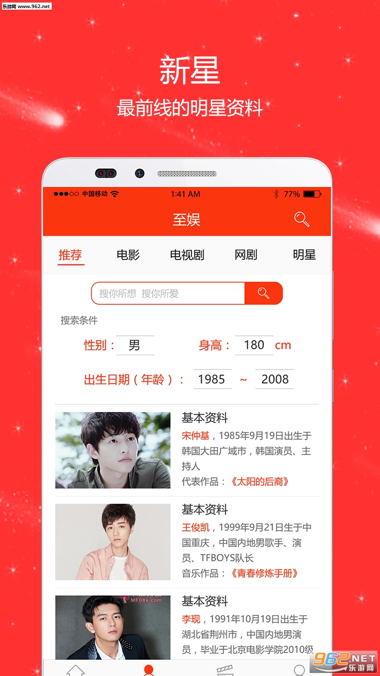 至娱APP是一个影视娱乐专业资讯发布平台,拥有电影、电视、网剧、明星等细致分类,以及视频展示板块。至娱APP演员的细致搜索方面独具特色,实现了对影视演员的细致分类。至娱APP在影视剧、网剧及影视新人的宣传推广上拥有良好的资源配置。