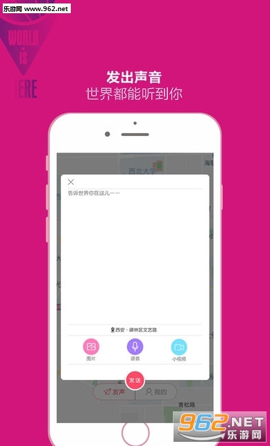 我在这儿是一款真正在地图上玩的社交APP;用户只需手机下载我在这儿APP即可一览地图上社交详情哟!发出声音,让世界都能听到你;图片,视频,语音任你选,怎么开心怎么来;一款超火爆的手机社交APP,你值得拥有。