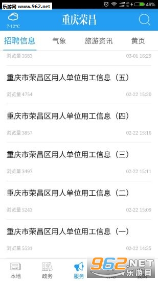 《重庆荣昌手机版》这是由重庆市荣昌县打造的资讯服务客户端。只要登录“重庆荣昌”APP,就能浏览本地资讯、政务信息等报道,同时还能享受到预约挂号、水电缴费、公交查询、违章查询以及吃喝玩乐等生活娱乐服务。感兴趣的用户可以下载客户端!
