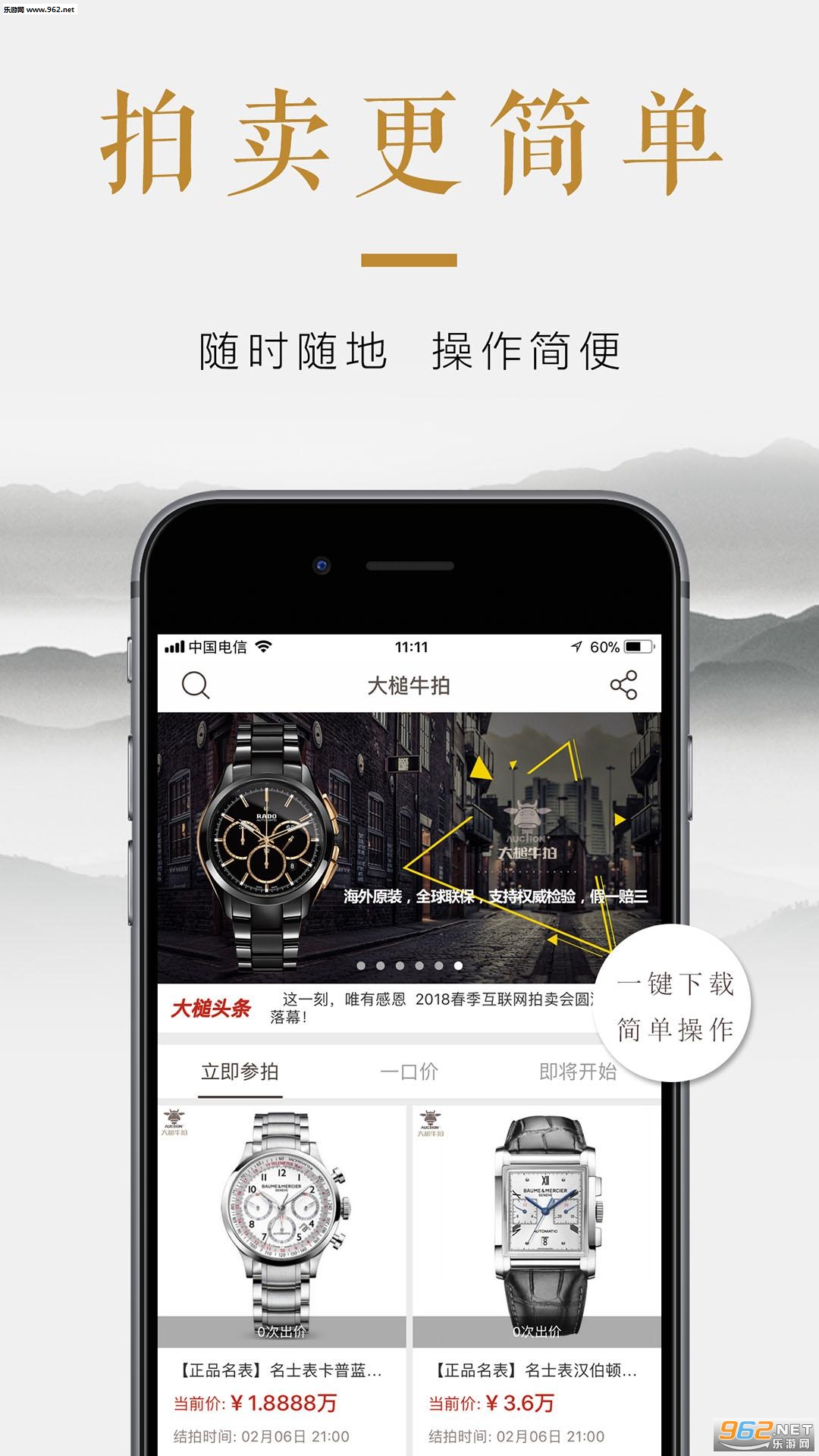 大槌牛拍APP是一款移动拍卖购物软件,全新自营模式的互联网 企业,主要从事名表 钻石等拍品的网络拍卖平台。专注网络拍卖交易,好的拍品,严格筛选,真正实惠,缺一不可,花更少的钱能拍到更优质的物品,只为品质生活,我们致力于做一款感动用户的产品。