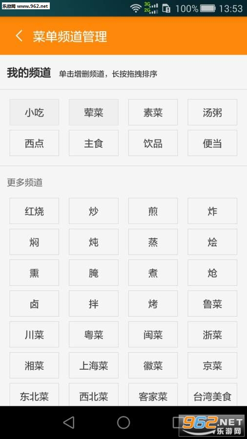 1、可自定义管理菜单频道,根据自己的喜好选择菜单频道,比如小吃、荤菜、素菜、汤粥、主食、饮品等;