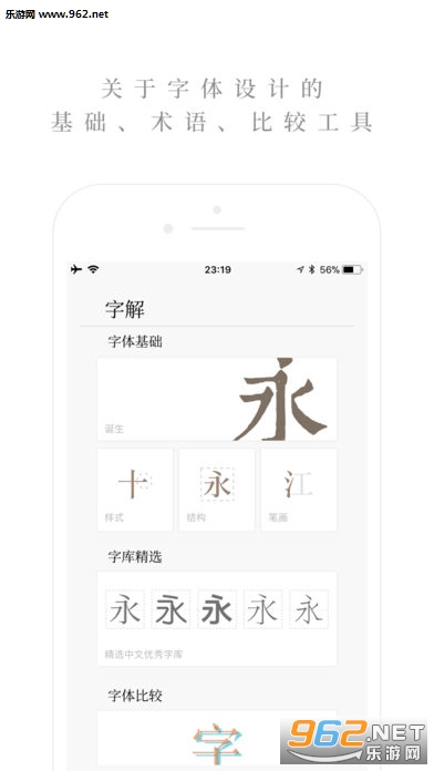 《字解》是一个基础性的工具,应用试图通过解析汉字的骨架、笔画粗细起收、黑白布局、术语解释和字体比较来表达这种思想,在这款应用上,你可以对字体设计具体包含了哪些信息有个比较粗略的了解,包括汉字的演变历史、字体结构、笔画变化后的称谓,不同字体的差别等内容。每一个中文字体的特点和故事都有一个比较清晰的讲解。